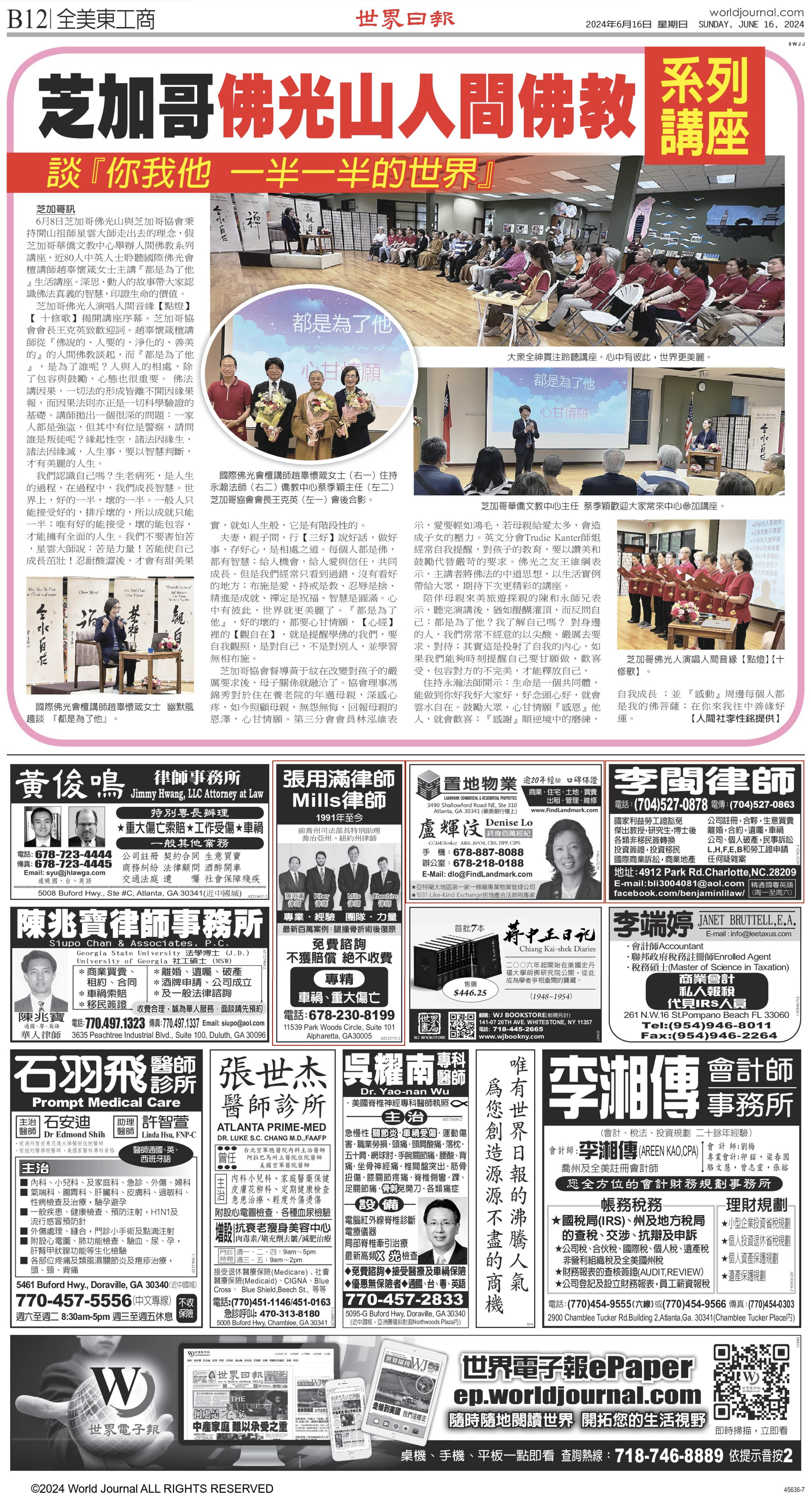 2024年6月8日芝加哥佛光山與芝加哥協會秉持開山祖師星雲大師走出去的理念,假芝加哥華僑文教中心舉辦人間佛教系列講座,近80人中英人士聆聽國際佛光會檀講師趙辜懷箴女士主講芝加哥佛光人演唱人間音緣【點燈】【 十修歌】揭開講座序幕。芝加哥協會會長王克英致歡迎詞。趙辜懷箴檀講師從『佛說的、人要的、淨化的、善美的』的人間佛教談起,而『都是為了他』,是為了誰呢?人與人的相處,除了包容與鼓勵,心態也很重要。 佛法講因果,一切法的形成皆離不開因緣果報,而因果法則亦正是一切科學驗證的基礎。講師拋出一個很深的問題:一家人都是強盜,但其中有位是警察,請問誰是叛徒呢?緣起性空,諸法因緣生,諸法因緣滅,人生事,要以智慧判斷,才有美麗的人生。