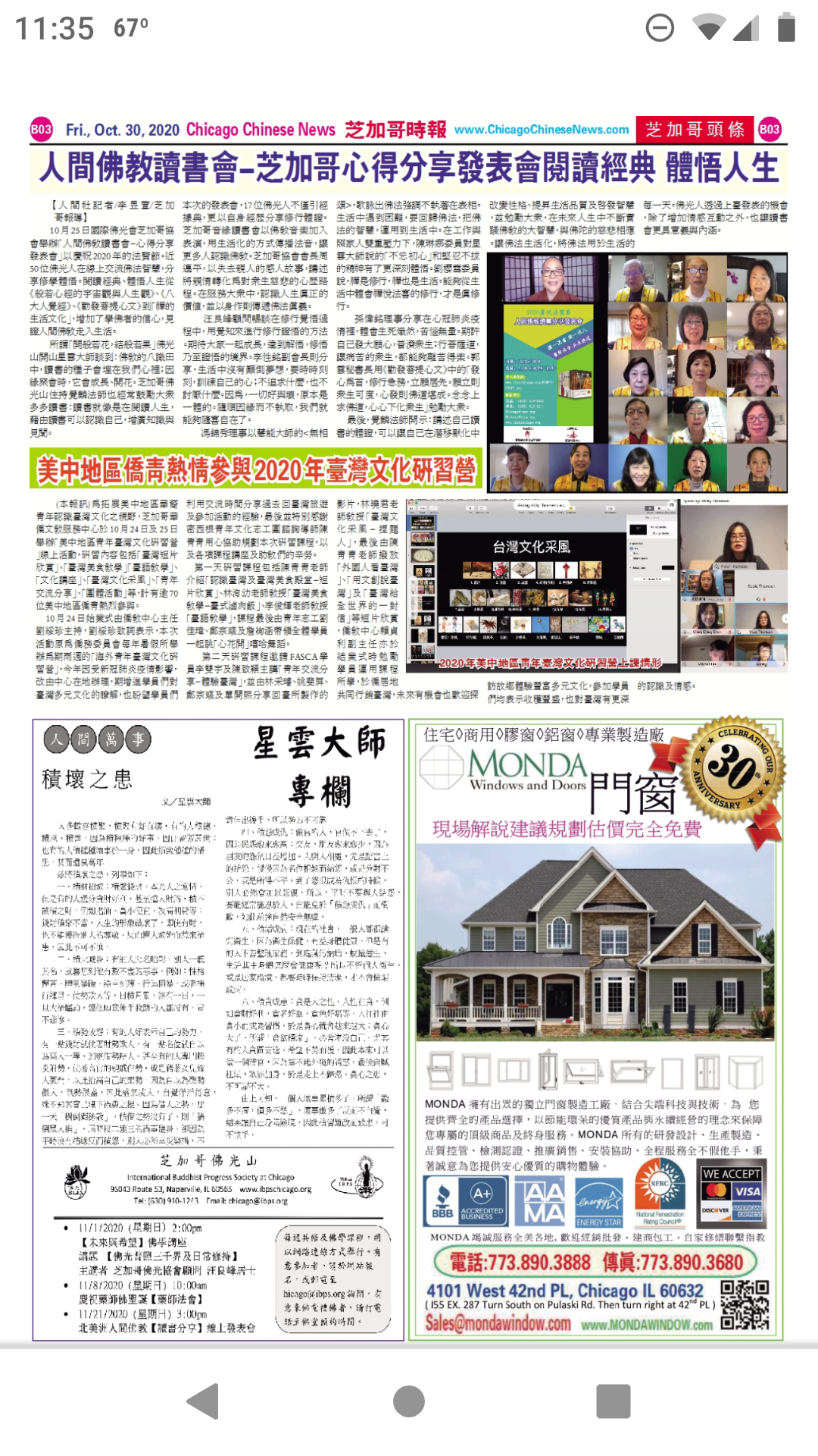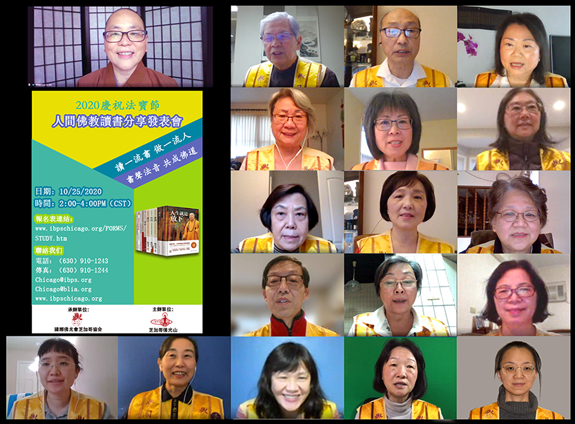 【人間社記者 李昱萱 芝加哥報導】10月25日國際佛光會芝加哥協會舉辦「人間佛教讀書會-心得分享發表會」以慶祝2020年的法寶節。近50位佛光人在線上交流佛法智慧,分享修學體悟。閱讀經典、體悟人生從《般若心經的宇宙觀與人生觀》、《八大人覺經》、《勸發菩提心文》到「禪的生活文化」,增加了學佛者的信心,見證人間佛教走入生活。