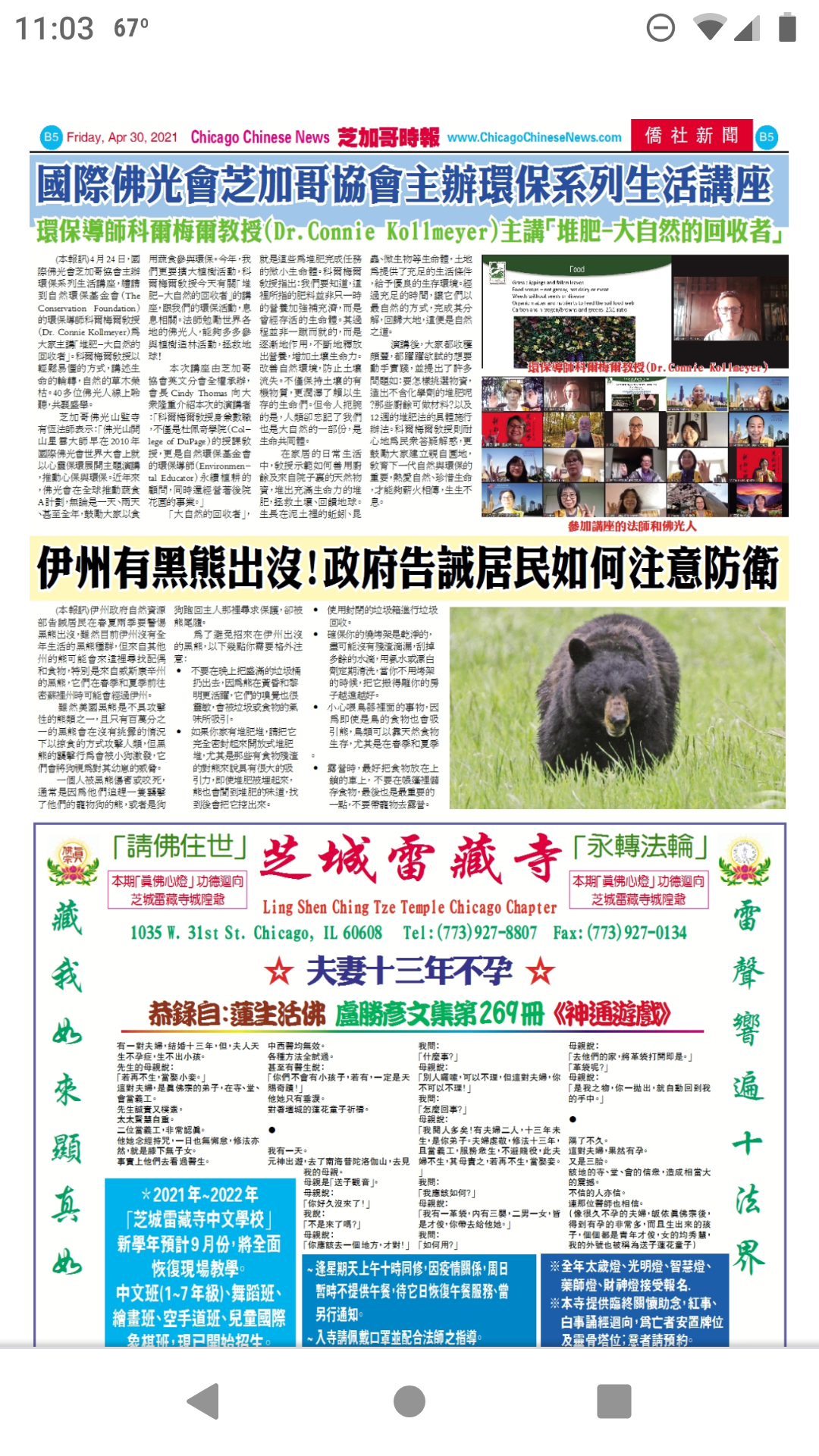 4月24日,國際佛光會芝加哥協會主辦環保系列生活講座,禮請到自然環保基金會(The Conservation Foundation)的環保導師科爾梅爾教授(Dr. Connie Kollmeyer)為大家主講「堆肥-大自然的回收者」。科爾梅爾教授以輕鬆易懂的方式,講述生命的輪轉,自然的草木榮枯。40多位佛光人線上聆聽,共襄盛舉。