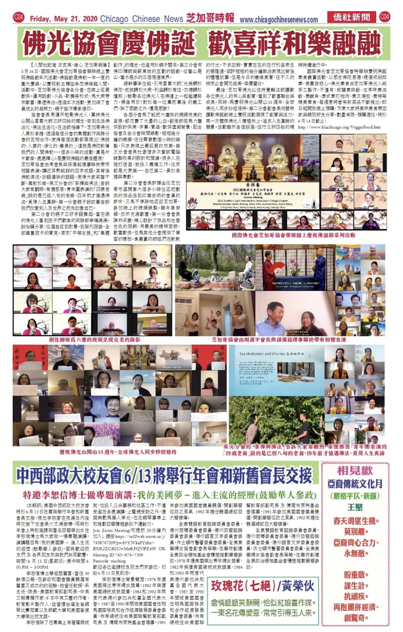 【人間社記者 王克英、緣心 芝加哥報導】5月16日,國際佛光會芝加哥協會舉辦線上慶祝佛誕節系列活動。佛誕節是佛教一年一度的重大慶典,以慶祝教主釋迦牟尼佛降誕人間。活動中,芝加哥佛光協會各分會,在線上莊嚴獻供。運用話劇、小品、歌舞等形式,為大眾帶來歡喜,傳遞佛法。透過本次活動,更加深了會員彼此的凝聚力,親子協作傳承信仰。