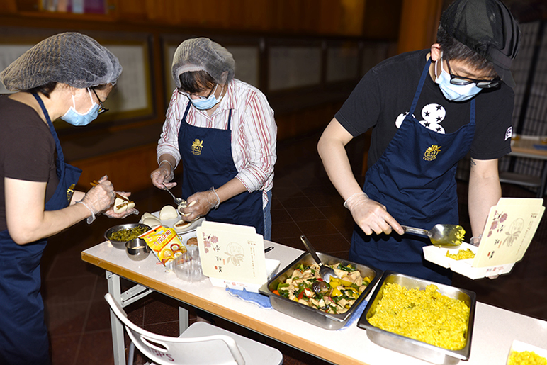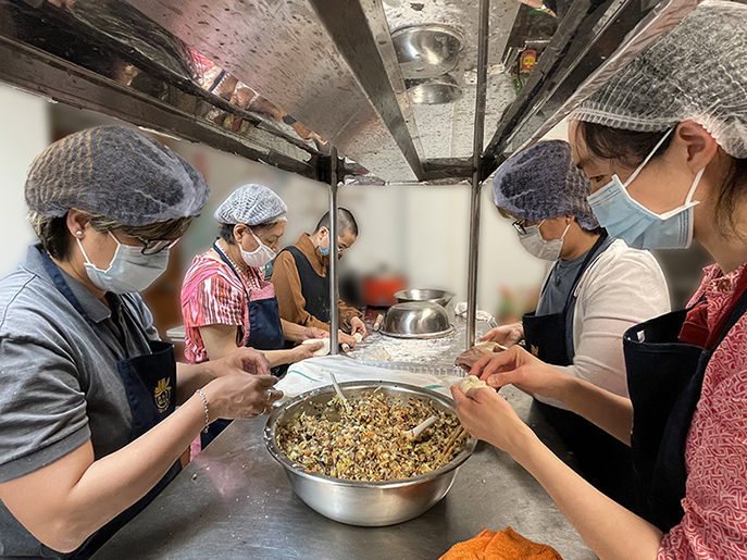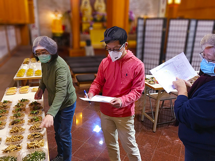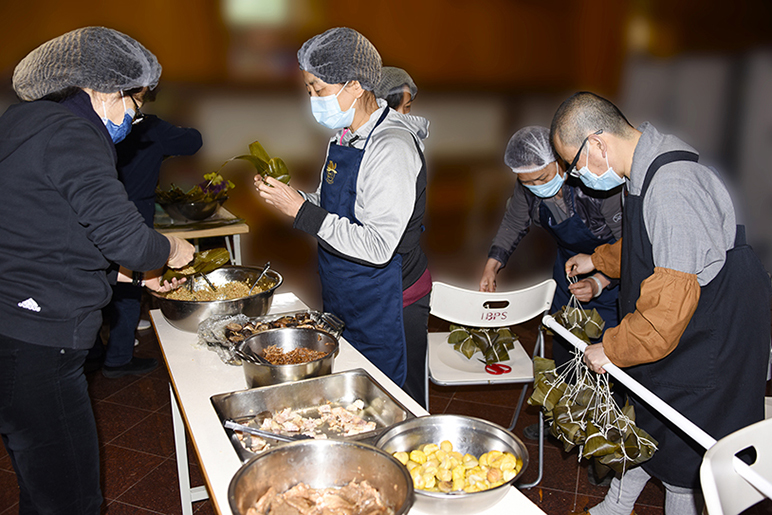 義工菩薩們在每週四上午整理出本週要製作的素粽與各樣素食的數量,準備食材。週五上午義工們忙著洗、切、炒、煮、包、蒸等專注且忙碌地將美味的素粽和素食在週末讓購買者帶回家享用。承辦單位第一分會會長林釆菱師姐在大寮料理食物站了一整天,拖者疲累的身軀回家,但是第二天還是一大早精神抖擻地又繼續到大寮準備素食。充分實踐了「大眾第一,自己第二」的人間佛教行者風範。