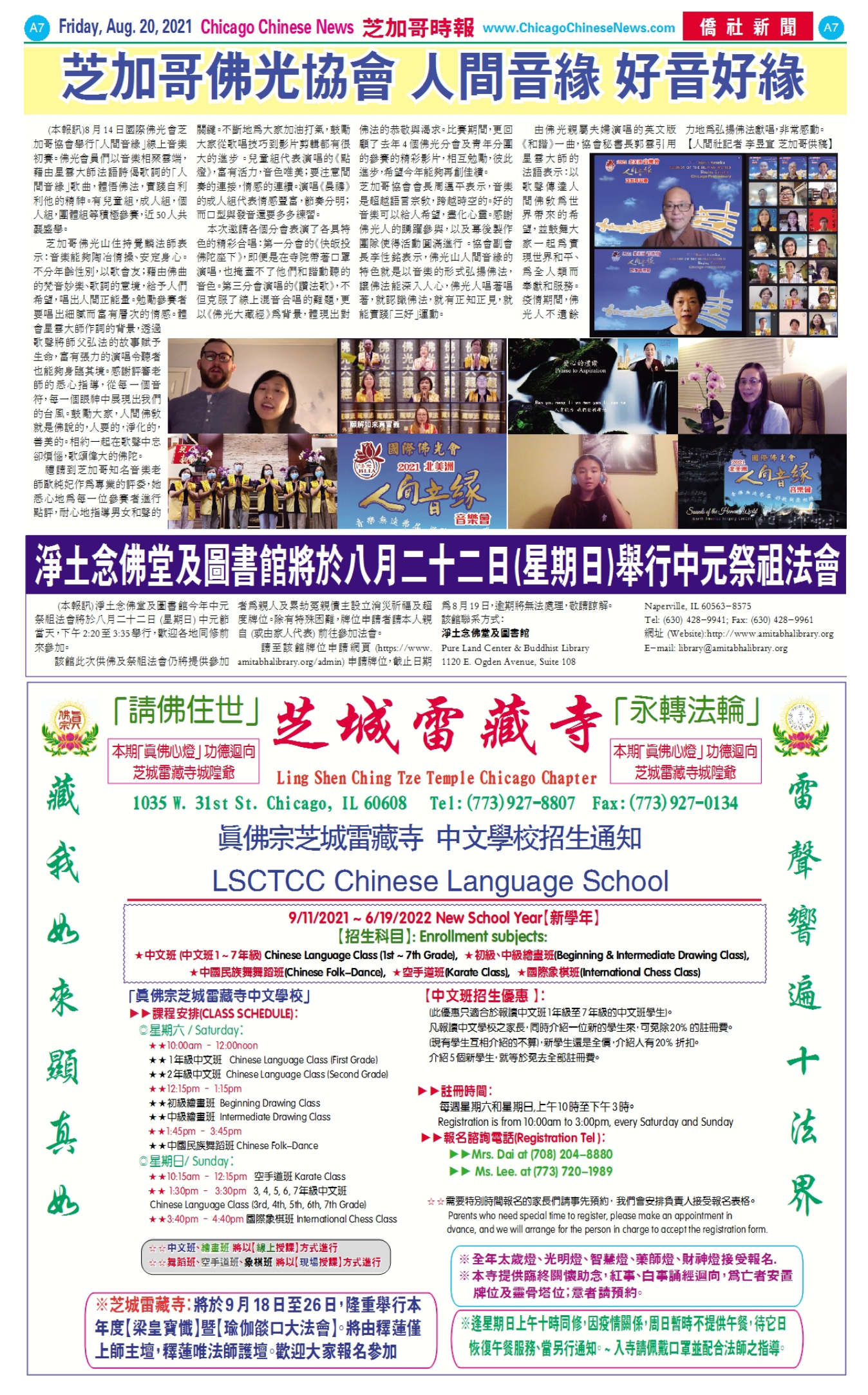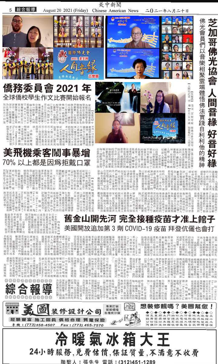 【人間社記者 李昱宣 芝加哥報導】8月14日國際佛光會芝加哥協會舉行「人間音緣」線上音樂初賽。佛光會員們以音樂相聚雲端,藉由星雲大師法語詩偈歌詞的「人間音緣」歌曲,體悟佛法,實踐自利利他的精神。有兒童組,成人組,個人組,團體組等積極參賽,近50人共襄盛舉。