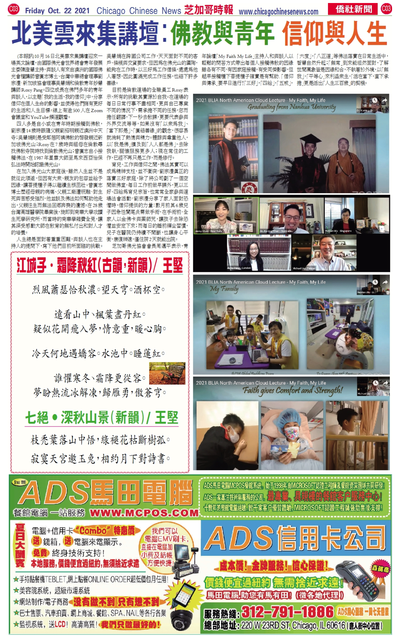 【人間社記者 郭雲 芝加哥報導】10月16日北美雲來集講壇迎來一場英文論壇,由國際佛光會世界總會青年發展主委陳澄慧主持,與談人有來自澳洲的國際佛光會檀講師曾廣志博士、台灣中華總會理事劉宗澧、新加坡協會理事吳慧娟和倫敦青年妙慧講師Roxy Pang。四位成長在佛門多年的青年與談人,以主題「我的生活,我的信仰」中,分享信仰在個人生命的影響,並使得他們擁有更好的生活和人生目標。線上有逾500人在Zoom會議室和YouTube頻道觀看。