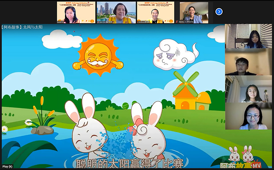 第三分會由汪顧問的孫子汪宗澤小朋友, 小小年紀以流利的中文爲大家帶來《星雲說喻》中發生在台灣80年代的一個真實故事「媽媽樂」。故事内媽媽的慈愛,小明的孝心和老闆的布施,都是我們學習的榜樣。理事孫偉銘則化身為孫叔叔爲大家説了一個「不妄語」的兒童音樂劇, 告訴大家不要像劇中放羊的孩子,以「狼來了」欺騙的方式愚弄村民, 結果害人害己。