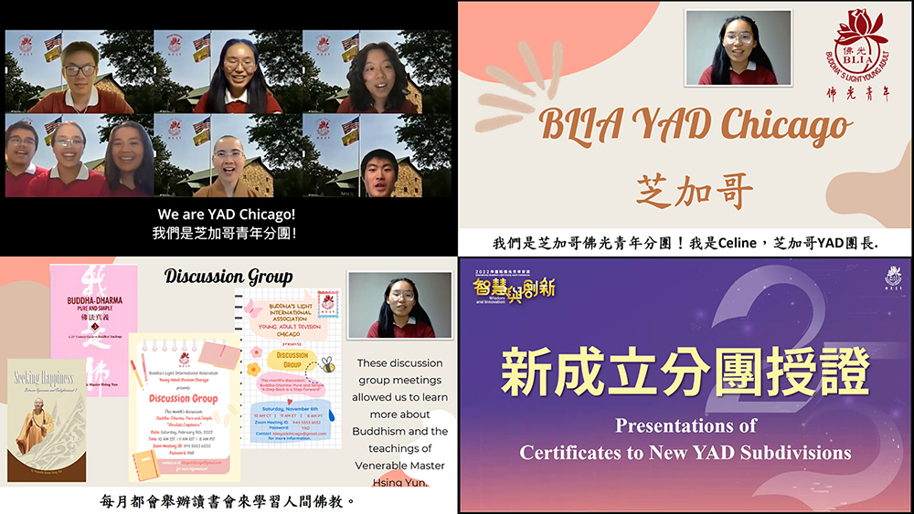 2022年國際佛光青年會議於7月16日線上與實體、全球同步盛大開幕,全球五大洲、28個國家地區近千位佛光青年雲端相聚,以「智慧與創新」為主題,結合聯合國永續發展目標分組,從科技、生死、信仰傳承等層面進行深入的討論。會議中,「芝加哥佛光青年分團」(YAD Chicago),正式授證成立;並為參加明年佛光青年大會於7月23日舉行蘋果派義賣活動。