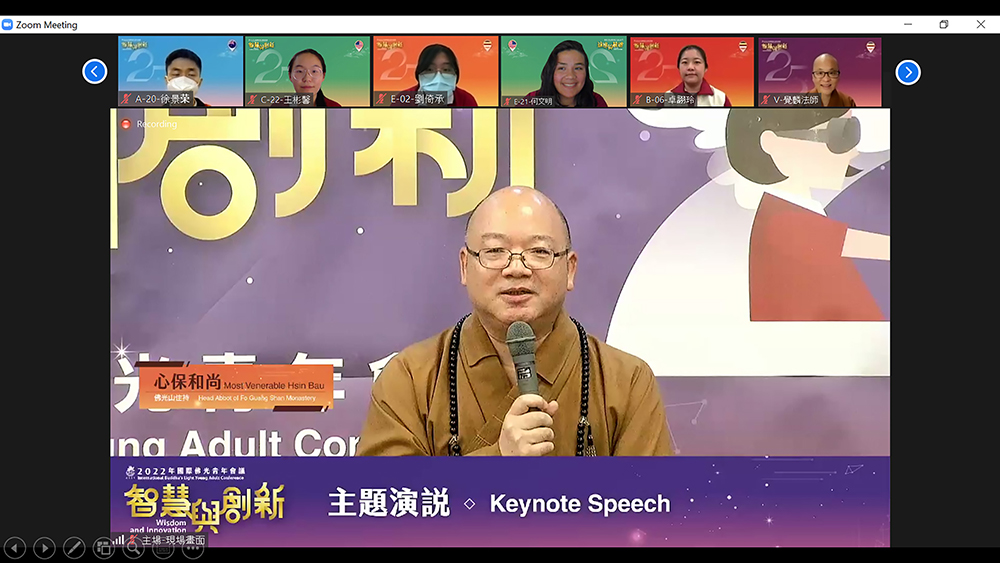 佛光山住持心保和尚於主題演說中,勉勵青年們說,青年能夠與佛法相遇、與生活相應,非常不容易。期許在智慧的基礎上,創新而不偏離佛法,能讓更多人接受,落實於生活中、創造好因緣。本次主題「智慧創新」,不因創新而失去智慧理念,而是創造因緣。更強調因緣的重要性,因為很多事情都需要助緣才能成就的。「好因緣來自正知正念」,與人為善、打招呼就是創造好因緣的開始!希望透過青年會議,讓大家對佛法的體驗更加深刻,並活用在每個當下。