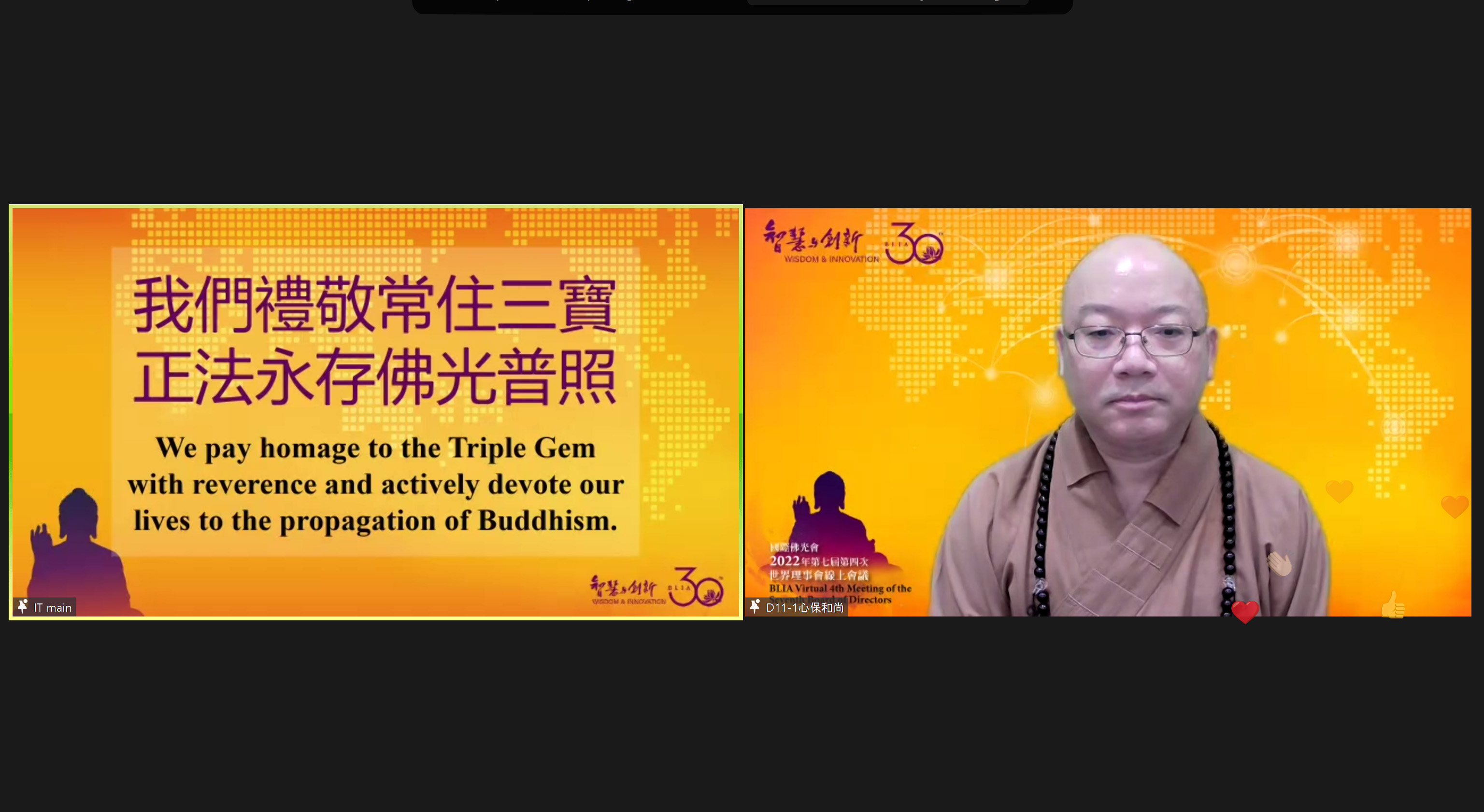 在萬衆矚目下為期8天的「國際佛光會2022年第七屆第四次世界理事綫上會議」於美中時間10月8日晚8時在「元宇宙」Vfair會議室舉行閉幕典禮。 國際佛光會世界總會總會長心保和尚致詞表示, 8天的活動充滿法喜與感恩,佛光會30年,一路見證了歷史,建立了里程碑。鼓勵所有佛光人對團體有信心,對佛法有信心,對人間佛教有信心;從實踐中體會,有信心就有力量,對人間佛教理念不退轉,讓世界變得越來越好,有您真好!
