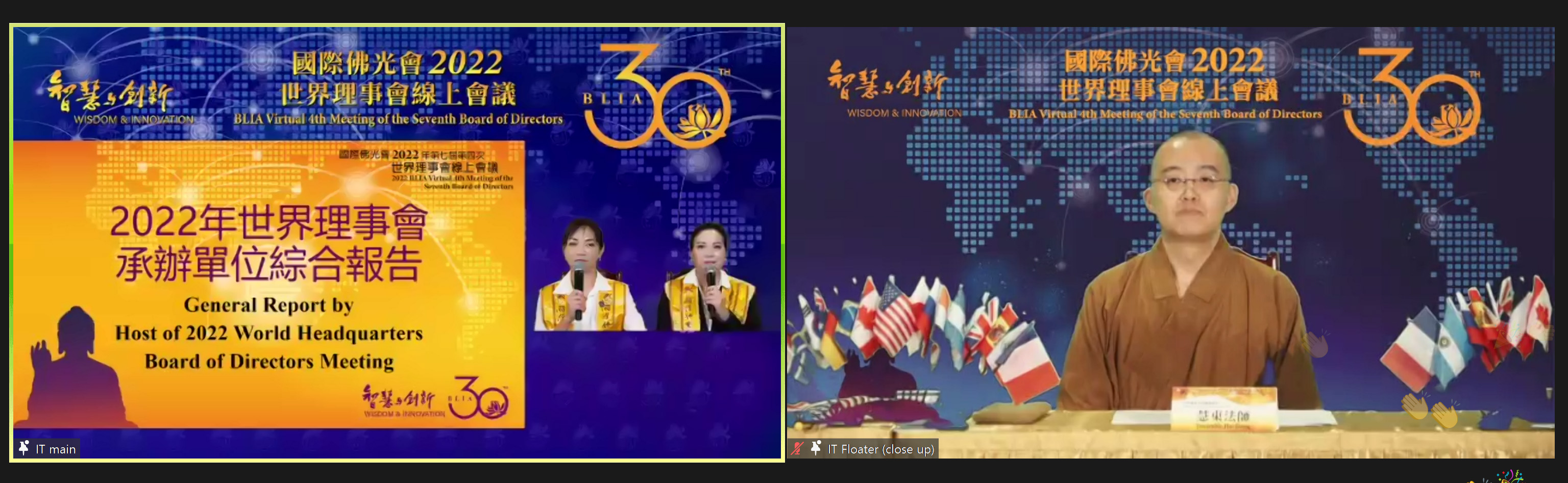 美西副秘書長慧東法師,代表2022年理事會議承辦單位:感謝美國 ,加拿大,哥斯大黎加三個北美洲的國家,共 27個協會的支持與付出,以及其他各洲協會的全力配合;並指出這次理事會議具有的十大特色: