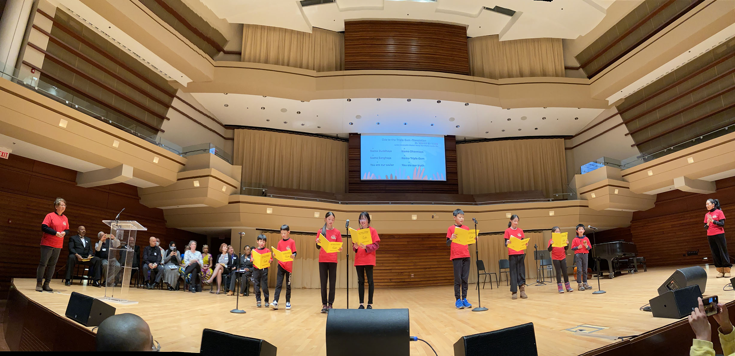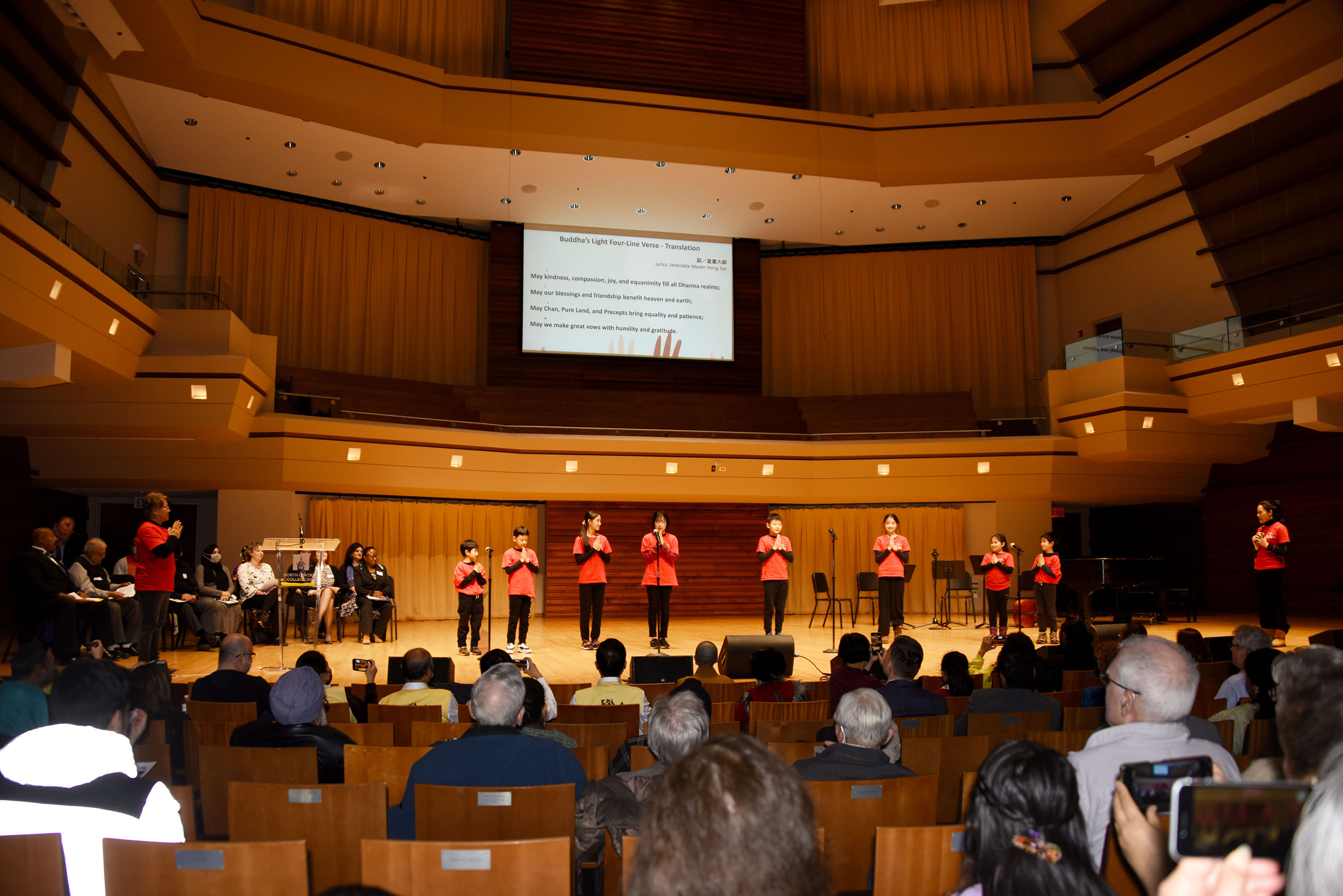 「常念佛光四句,做個三好小菩薩!」汪宗澤小菩薩是芝加哥佛光協會顧問汪良峰居士的長孫,充滿自信地向大家介紹團隊成員及表演內容。年僅7歲的馮雲翊熟練地敲打著木魚聲,小菩薩們一同為大眾獻上莊嚴的「三寶頌」。再配上可愛的手印及動作,唱小星星版「佛光四句偈」,充滿童趣,給人歡喜。北中大學宗教係主禮牧師Rev. Eric Doolittle更是讃嘆汪宗澤小菩蕯開場介紹活動內容時的穩健台風,頗有大將之風!馮雲翊的木魚節奏有序!在場的觀眾們掌聲雷動,對小朋友們表演的高度讚揚。