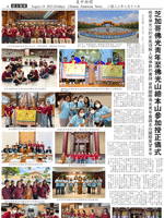 芝加哥佛光青年分團團長王彬馨(Celine Wang)從國際佛光會署理會長慈容法師手中緩緩接過青年團授正肩帶,象征著在芝加哥青年多年的努力之下,青年分團正式成立。特別的是他們中有3對9位姐妹和一雙兄弟齊上陣,與來自世界各地的佛光青年交流學習,更發願再接再厲未來要成為白象幹部,將所學所感帶回芝加哥,與美國的青年朋友分享。Celine通過尋根禮祖,青年們認定佛光山就是我們法身慧命之家;星雲大師「佛教需要青年、青年需要佛教」的理念深植在我們每個人的心中,點亮我的人生。在佛光山的日子,團員們留下了彌足珍貴的回憶,更是日後弘法利生的動力。