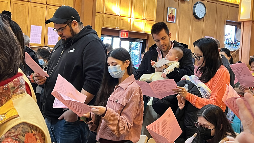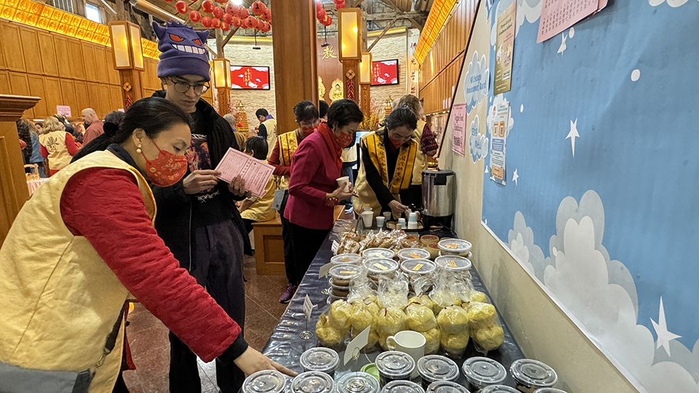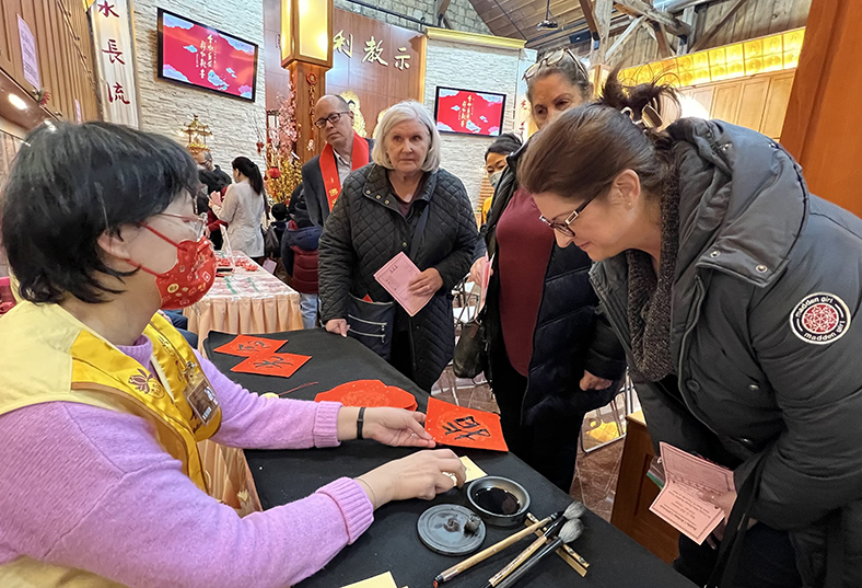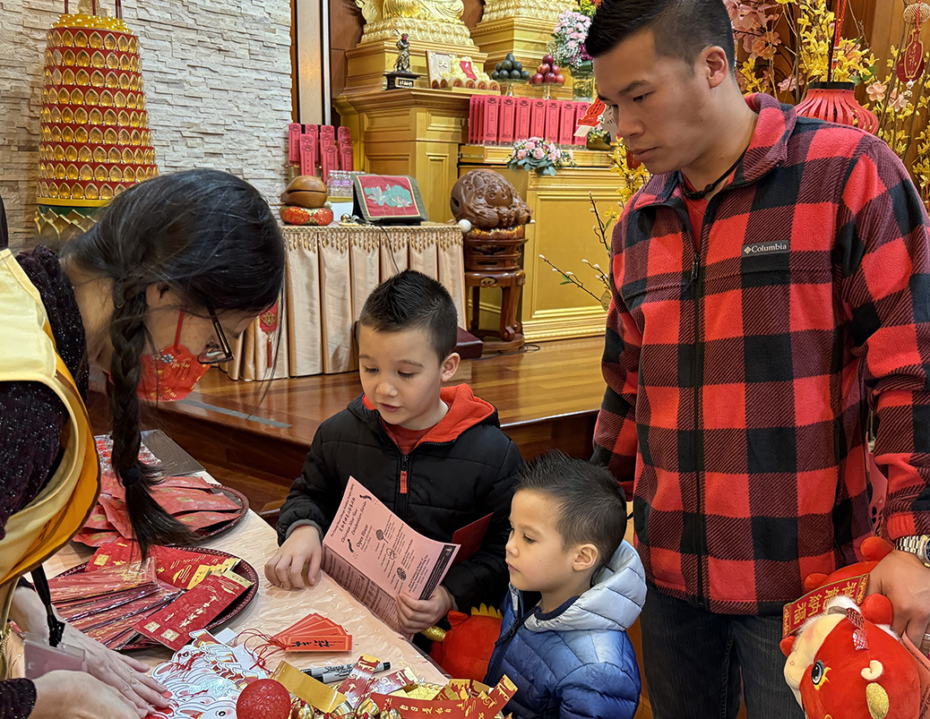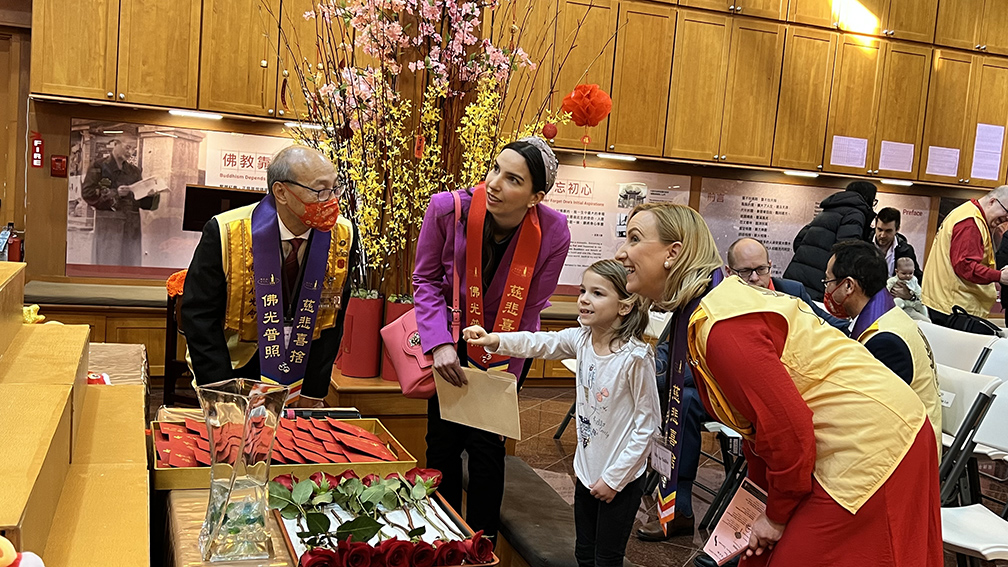 鄰居們與佛友開心寒暄;大學生們由老師領隊到各個文化攤位,了解過年習俗,在打卡點前與家人或好友留影;華人帶著同事初訪道場;年輕男女相偕拜佛祈願;一家三代父母虔誠跪於佛前祈求全家安康、小孩們開心地與龍寶寶合照。人人臉上洋溢著歡喜笑容,這些都是年初一芝加哥佛光山的快樂景象,也是佛光人對大師「給人歡喜」的實踐。