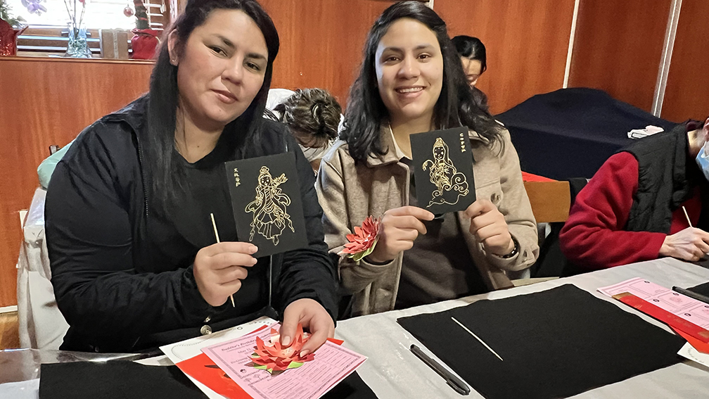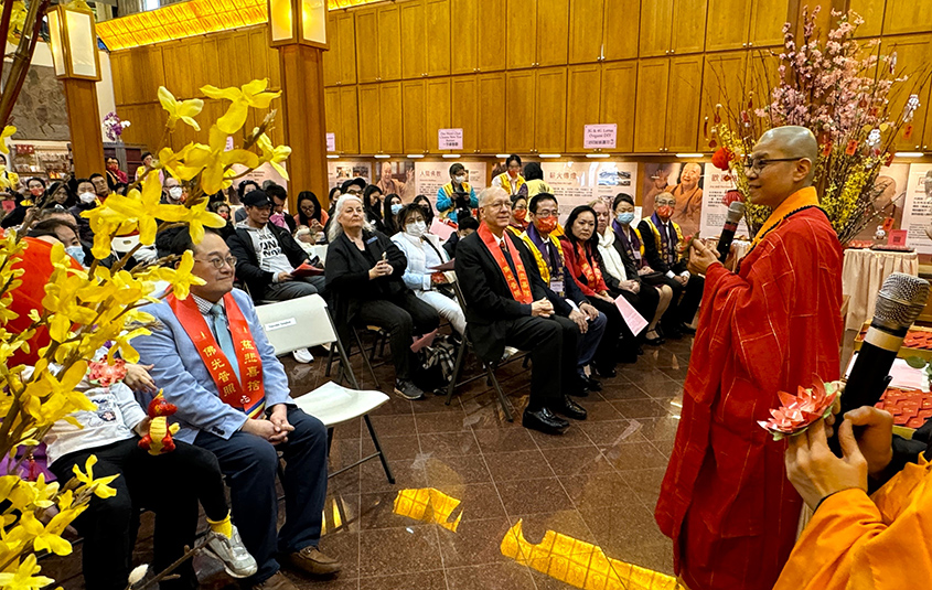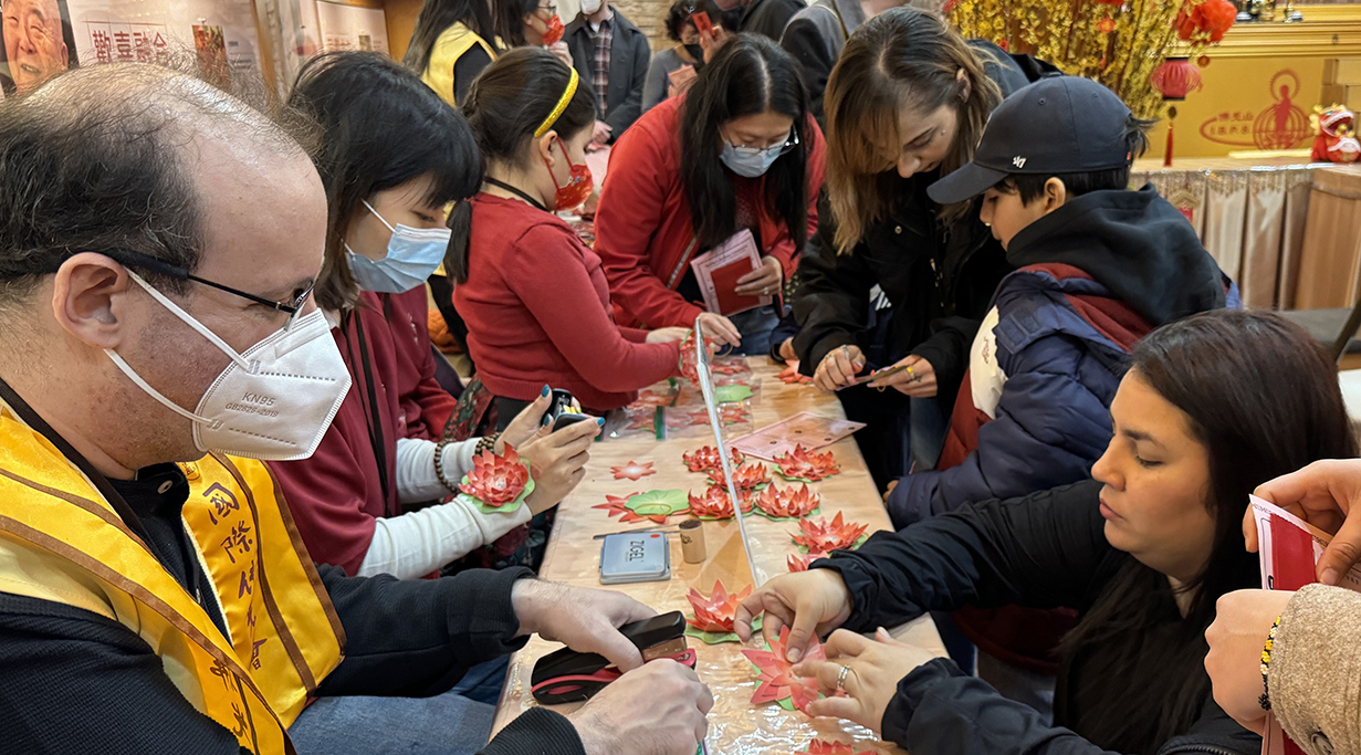 住持永瀚法師送給每位來訪者一朵代表歡喜和諧的蓮花,並開示:我們奉行星雲大師「三好四給」的教導;給不是口號,而是要在日常生活中實踐。廣結善緣,「給」出去,創造社會的幸福與和平。監寺有恆法師介紹春節文化活動,藉由本次的因緣,讓芝加哥佛光山周邊的芳鄰們,有機會走進佛教寺院,體驗一場富有人間佛教精神的文化饗宴,內容有:星雲大師墨寶拓印、菩薩刮畫、獻燈、祈願卡、自製燈籠、三好四給紙蓮花、抄寫佛光菜根譚、素食義賣、新春打卡拍照等。