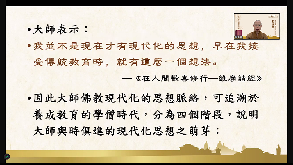 妙主法師則導讀第六章〈成功實現佛教現代化的重大轉型〉,從思想、方法、歷程及內涵等層面,說明星雲大師如何以人文、理性、科學、經濟等觀點,推動佛教現代化,創建具有時代價值的人間佛教新典範。法師總結星雲大師的成就包括建構人本佛教、塑造現代形象、引領宗教現代化與開創佛教新紀元,並以「法幢不容傾倒,慧燈不可熄滅」勉勵大眾持續傳燈。
