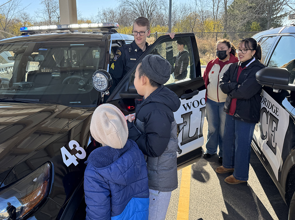 在Woodridge市警察局,警長Alec Sander親自接待並接受禮籃。他帶領學員參觀警局、示範警用設備,並介紹不同功能的警車。孩子們對警笛聲響、車內器材充滿好奇,踴躍提問,現場氣氛輕鬆活潑。Sander多次感謝大家的心意,並肯定佛光會推廣善行的精神。