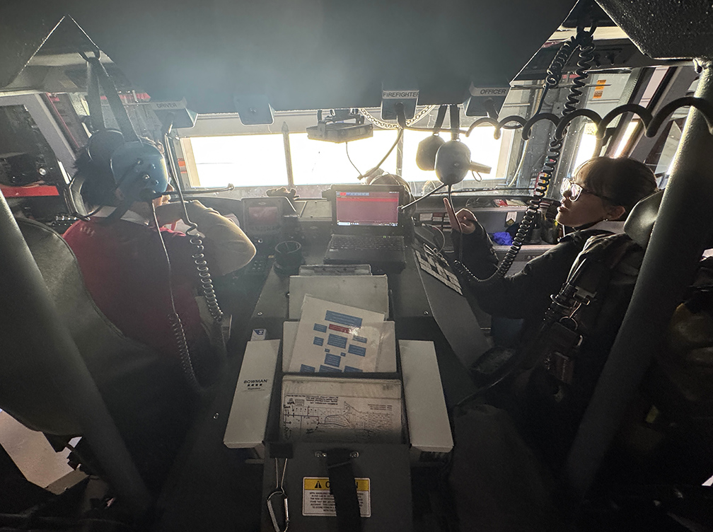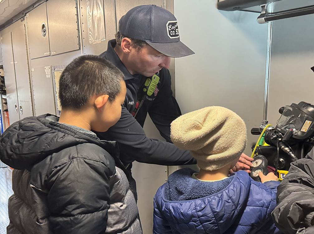 在消防局,消防人員接過禮籃與祝福卡後,隨即帶領團隊參觀消防車與救援器材,介紹日常訓練與出勤流程。學員們登上消防車、近距離觀察裝備,充分了解消防員的專業與膽識。正當參觀接近尾聲,消防隊突然接獲緊急出勤通知,消防車伴隨警笛聲迅速駛離,讓孩子們真切感受到消防工作的即時與重要,也為這趟行程留下深刻印象。