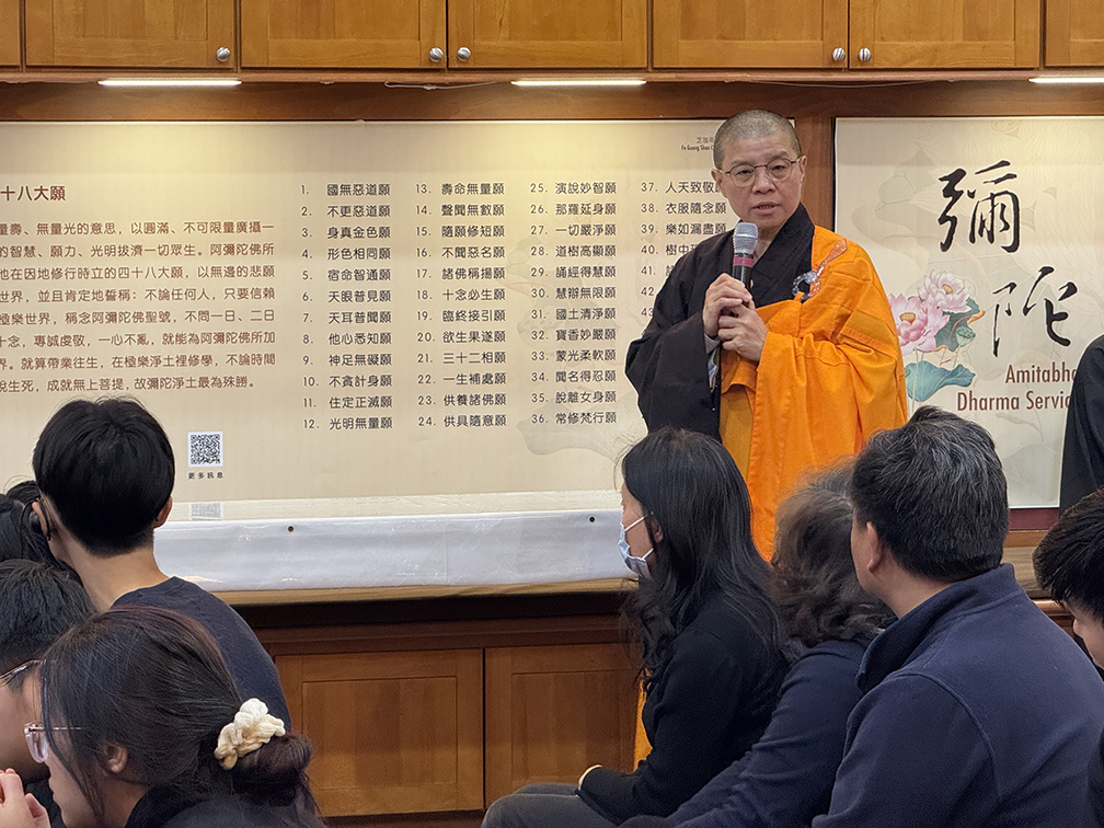 下午圓滿香,住持開示《阿彌陀經》的結構與意涵,說明「如是我聞」代表佛陀教法的真實傳承,並指出極樂世界環境莊嚴,山河草木皆演說妙法;此外,更引述日本科學對水結晶的研究,勉勵大眾「佛法生活化」,以清淨心對治煩惱,提醒大眾往生淨土需具善根與福德因緣,「迴向」更是修行不可缺少的環節。