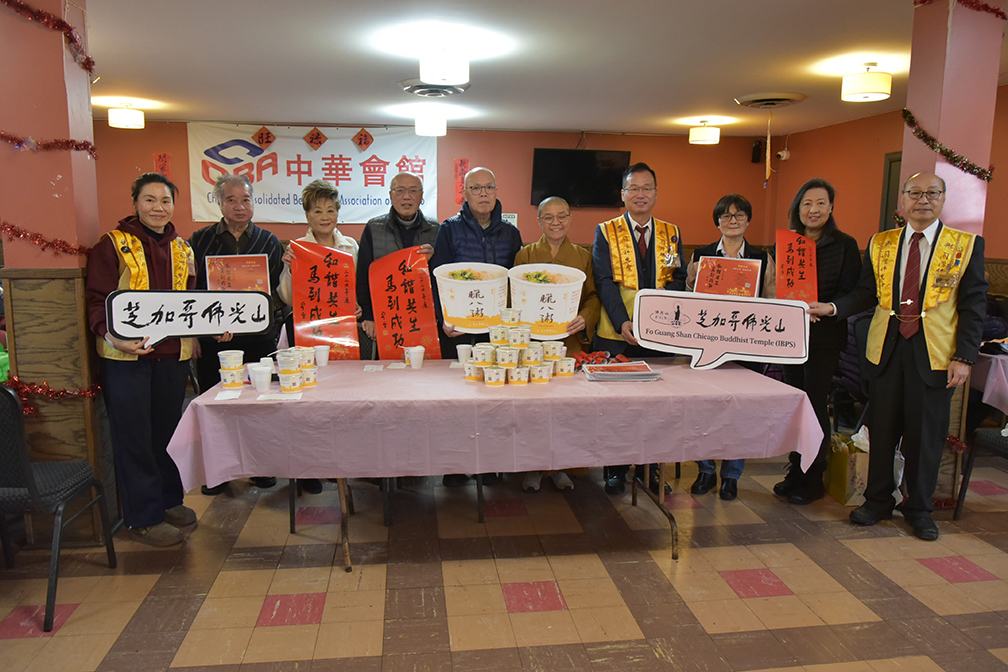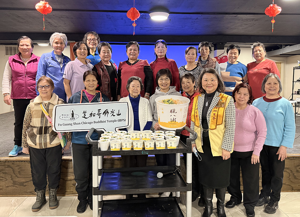 緊接著於1月15及17日展開二日的「臘八粥送光明」活動,將佛法落實於社會關懷。義工不畏寒流,清晨齊聚道場熬煮臘八粥,共計1千餘碗。1月15日完成400餘份,由永瀚法師率團前往中華會館致贈,並向長者開示,帶領合唱〈四給歌〉,致贈臘八粥與結緣品,傳遞關懷與祝福,同日並拜會駐芝加哥台北經濟文化辦事處處長類延峰,雙方就佛教文化推廣及人工智慧與社會變遷進行交流。當日,芝加哥協會督導長黃于紋亦將 100碗臘八粥送往常春藤老人中心,深受長輩歡迎。