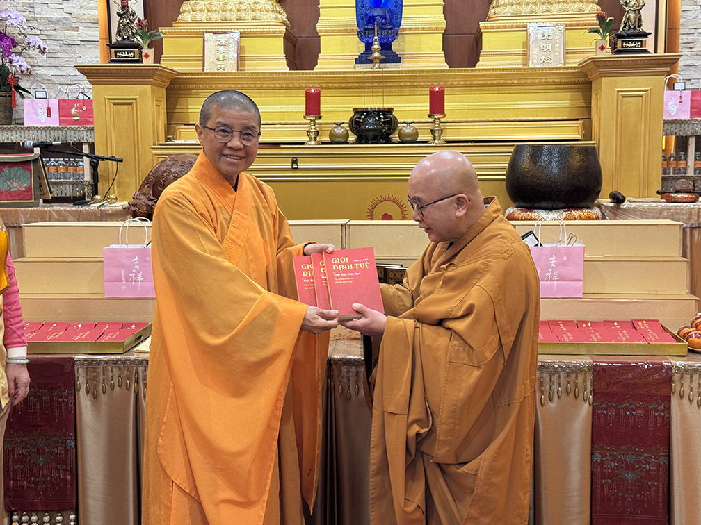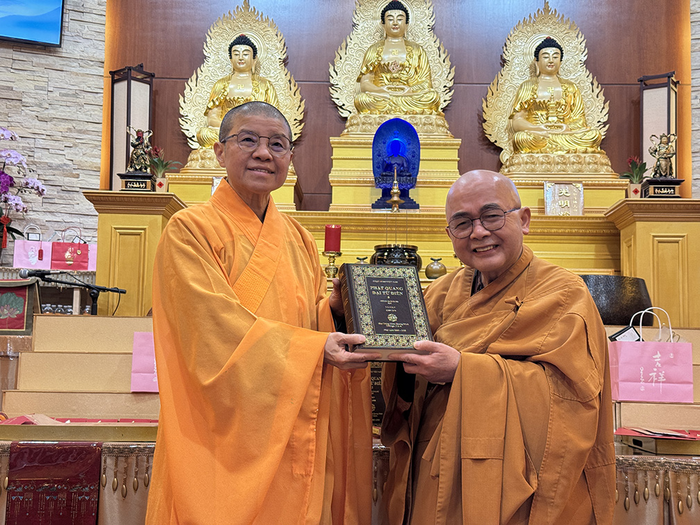 活動中,明行法師贈送全套精裝越文版《佛光大辭典》及《和平之途》等佛學書籍,永瀚法師回贈星雲大師越文著作《人間佛教的戒定慧》及墨寶紅包組,期勉兩寺未來齊心弘法,祝福大眾平安吉祥。義工菩薩則提供越南點心及福圓茶,交流加深了芝加哥漢傳與越南佛教的互助情誼,也彰顯人間佛教的廣大影響力。